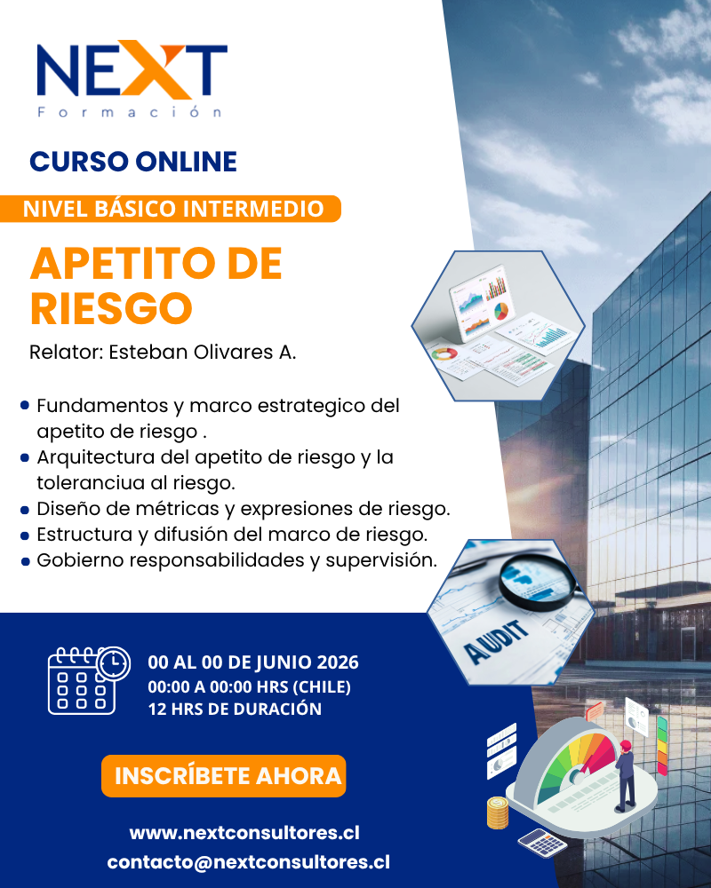 El objetivo del curso es entregar a los participantes las herramientas conceptuales y metodológicas necesarias para definir, medir y gestionar el Apetito y la Tolerancia al Riesgo bajo los estándares globales del BIS (Banca de Pagos Internacionales) y el marco COSO ERM 2017.