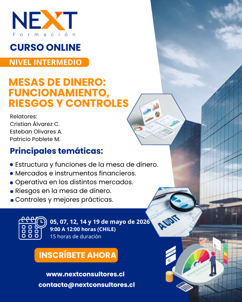 Este curso entrega una comprensión profunda de las operaciones y riesgos en mesas de dinero, centrado en instrumentos de renta fija, monedas y derivados. Con enfoque práctico, aborda vulnerabilidades clave, metodologías de control y herramientas efectivas para su auditoría, supervisión y control. Incluye casos reales y técnicas para fortalecer la detección, prevención y respuesta ante riesgos en entornos regulados.